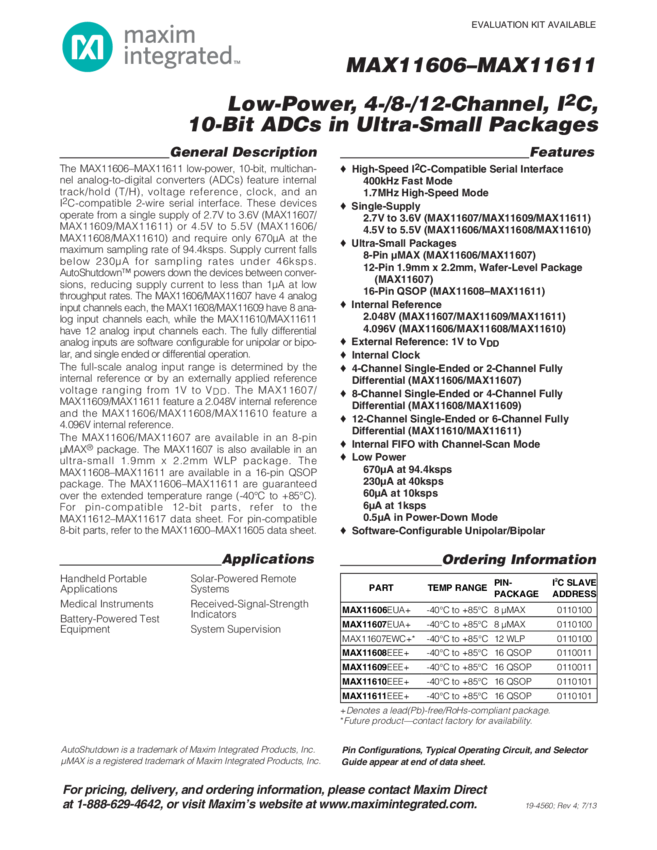 MAX11606, MAX11607, MAX11608, MAX11609, MAX11610, MAX11611 2.7V to 3.6V and 4.5V to 5.5V, Low-Power, 4-/8-/12-Channel, 2-Wire Serial 10-Bit ADCs