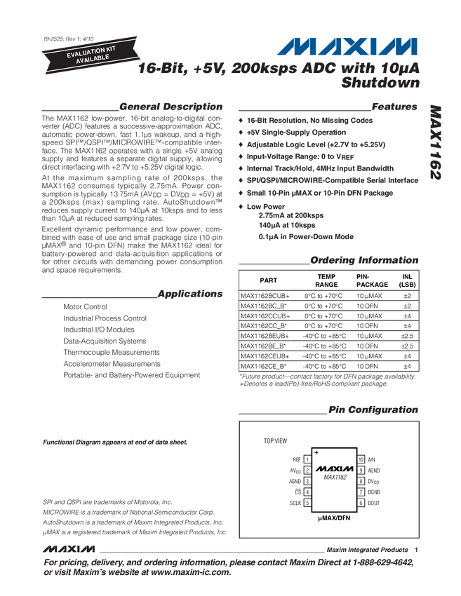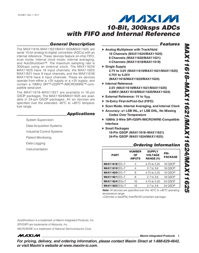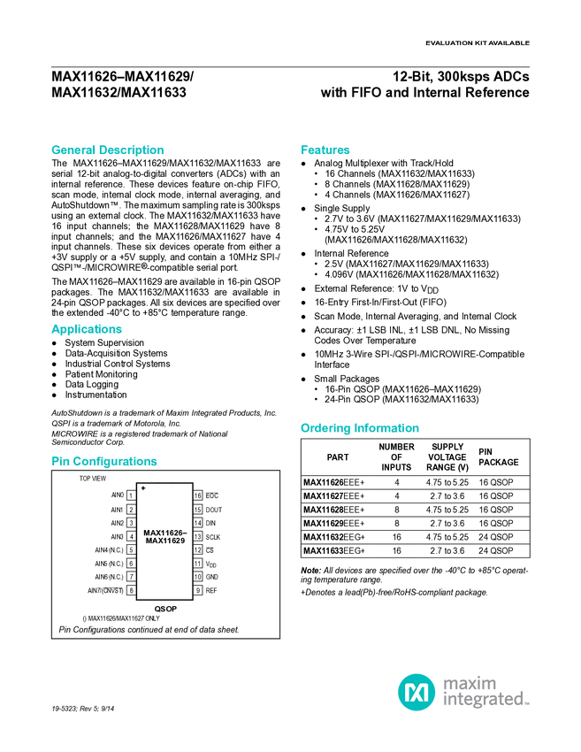 MAX11626, MAX11627, MAX11628, MAX11629, MAX11632, MAX11633 12-Bit, 300ksps ADCs with FIFO and Internal Reference