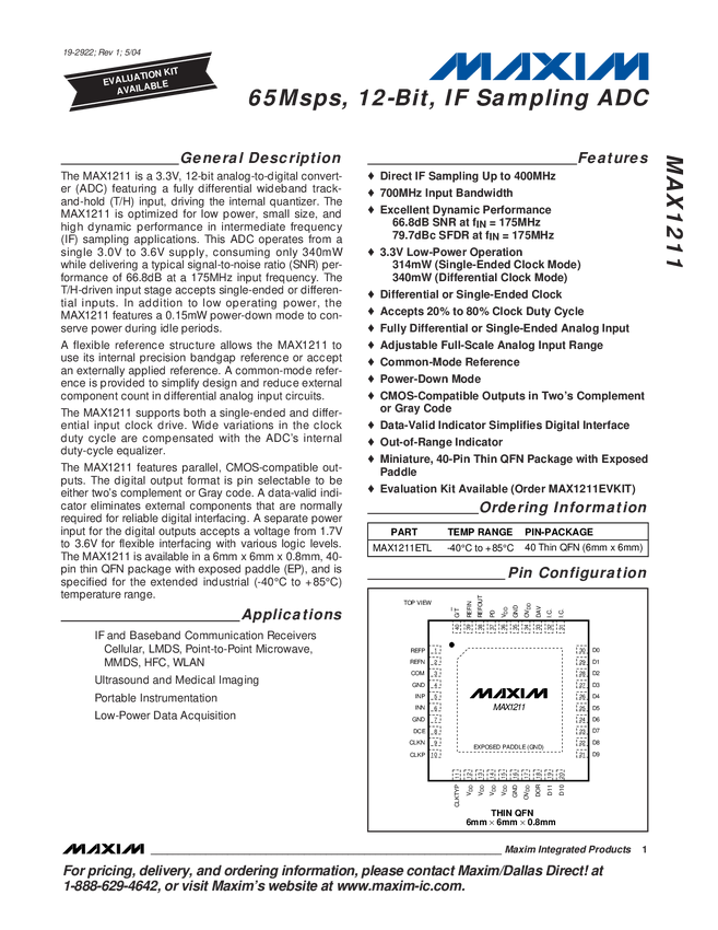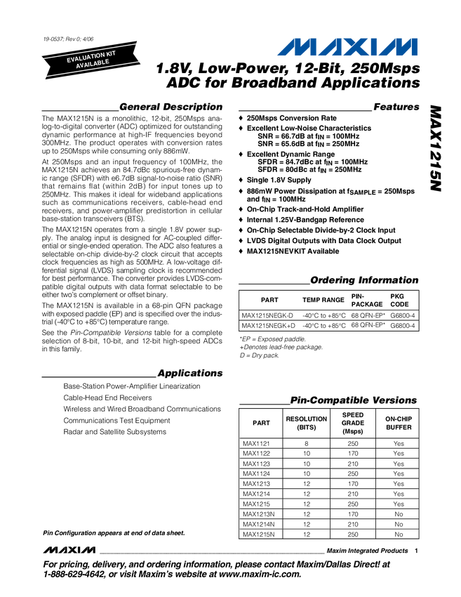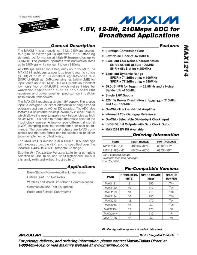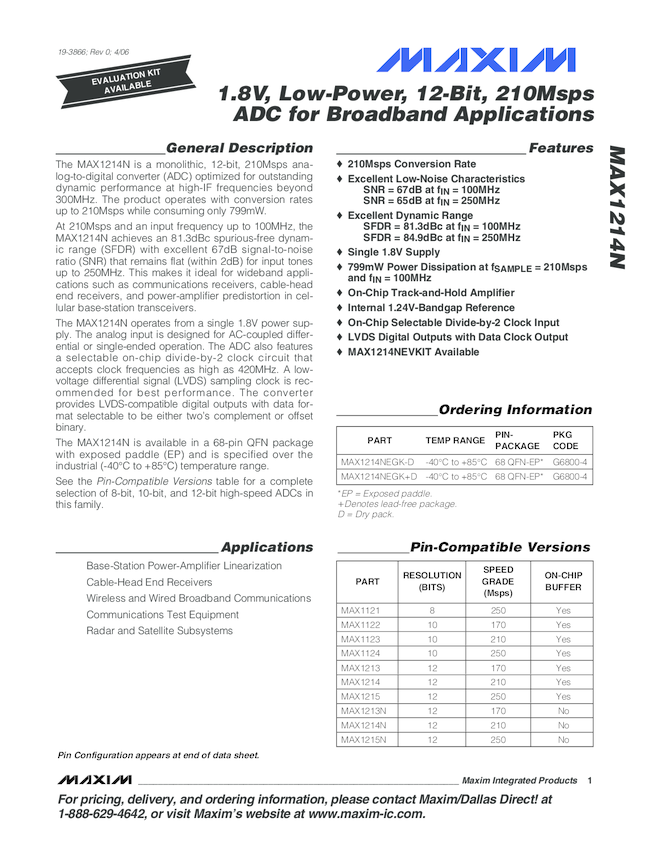 MAX1214N 1.8V, 12-Bit, 210Msps ADC for Broadband Applications