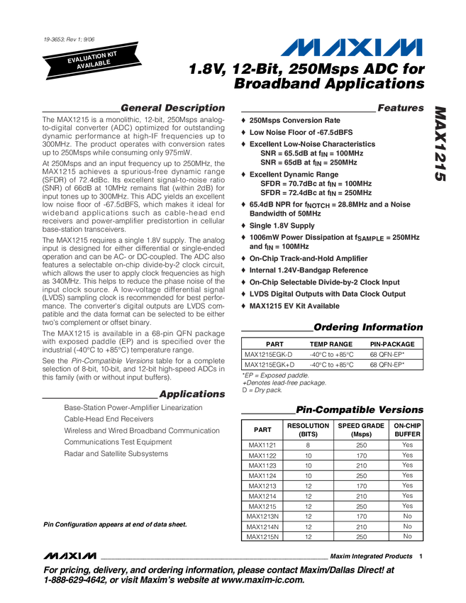 1.8V, 12-Bit, 250Msps ADC for Broadband Applications