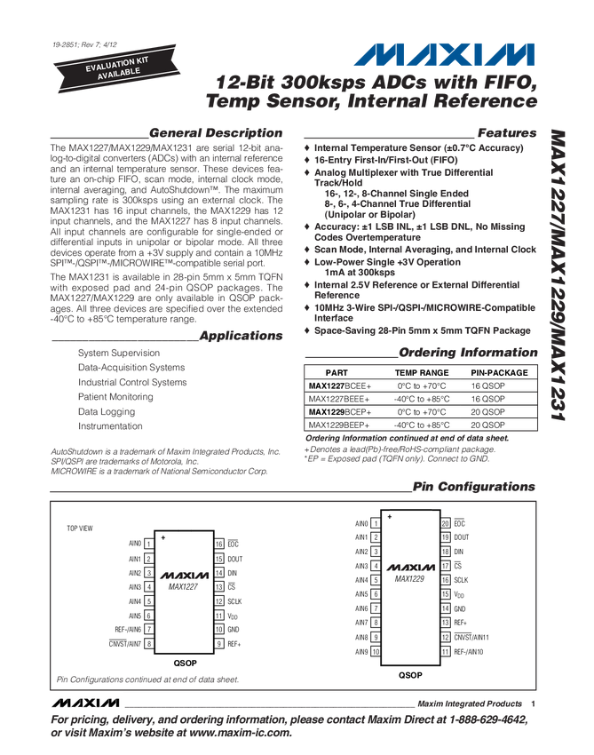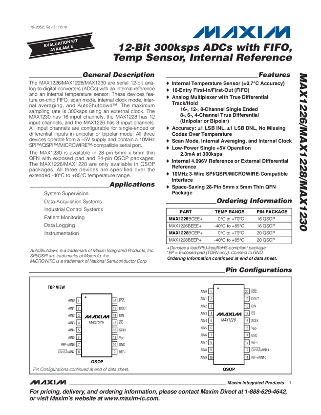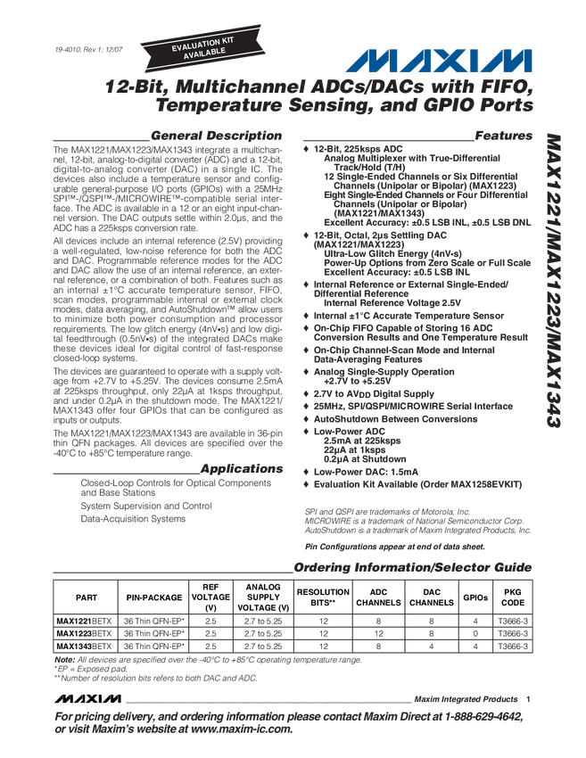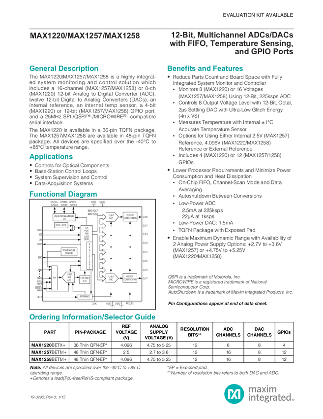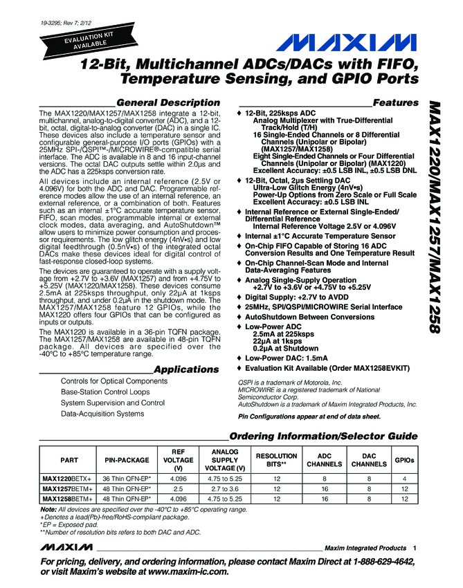 MAX1220, MAX1257, MAX1258 12-Bit, Multichannel ADCs/DACs with FIFO, Temperature Sensing, and GPIO Ports