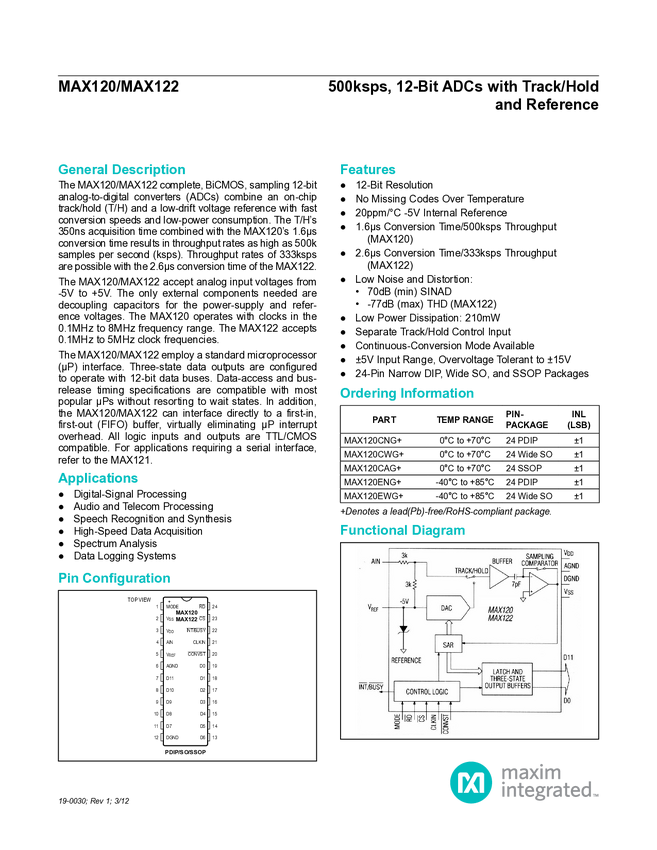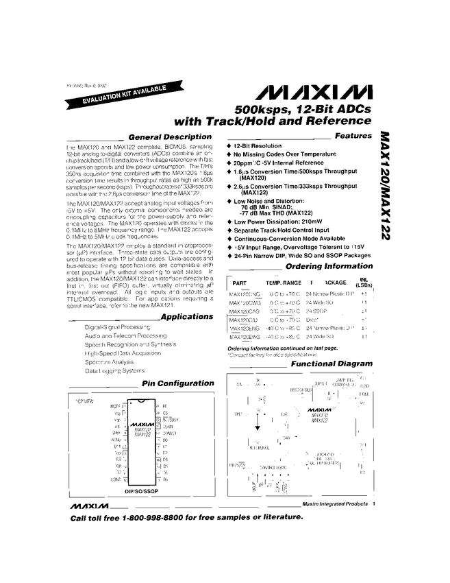 MAX120, MAX122 500ksps, Sampling, 12-Bit ADC with Track/Hold and Reference