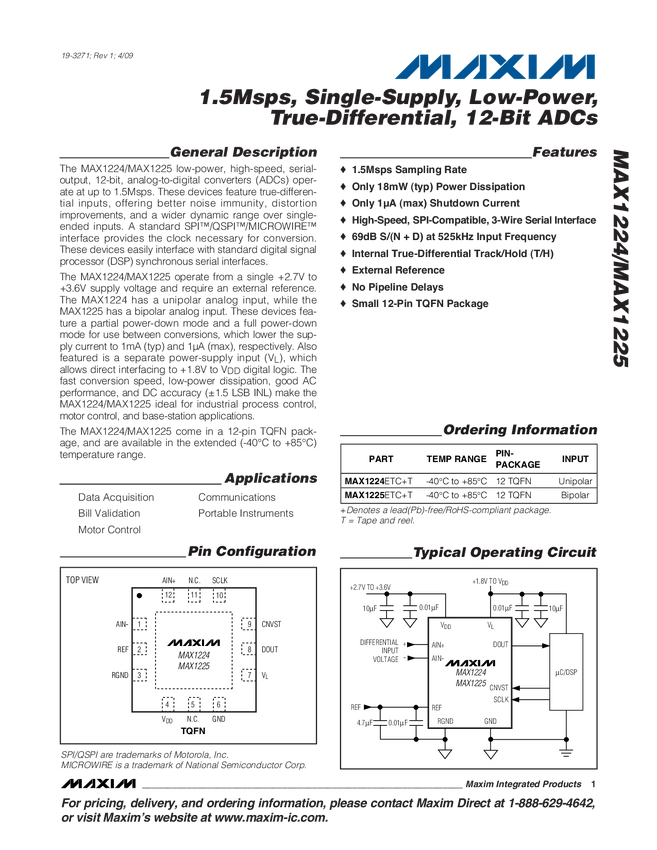 1.5Msps, Single-Supply, Low-Power, True-Differential, 12-Bit ADCs