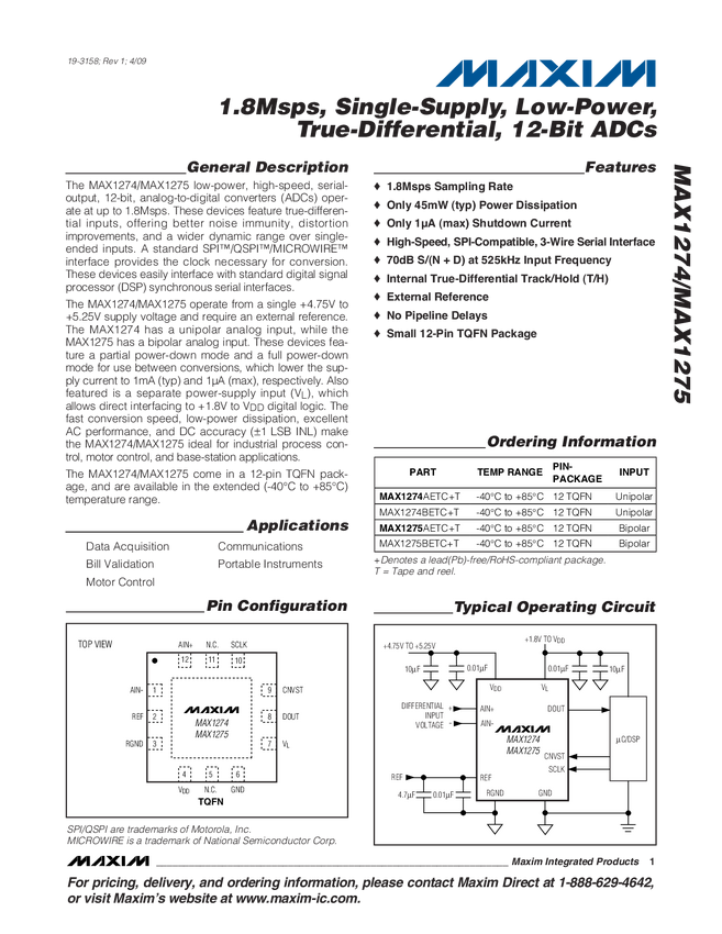 1.8Msps, Single-Supply, Low-Power, True-Differential, 12-Bit ADCs