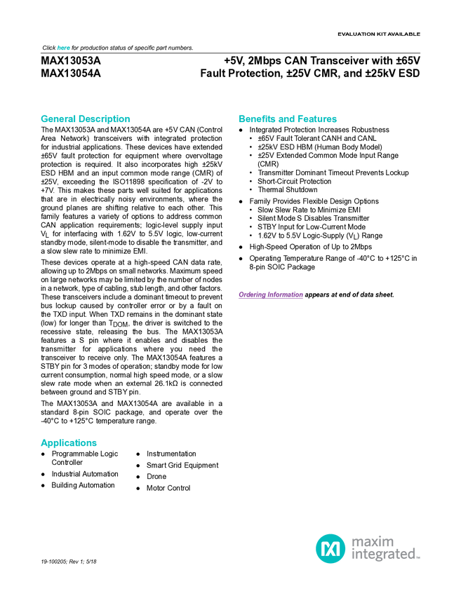 MAX13050, MAX13052, MAX13053, MAX13054 Industry-Standard High-Speed CAN Transceivers with ±80V Fault Protection