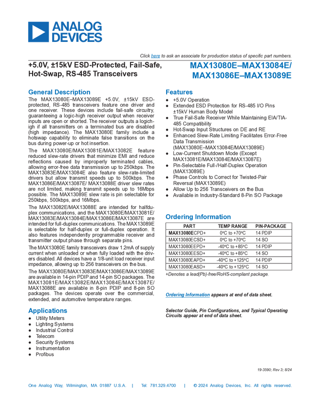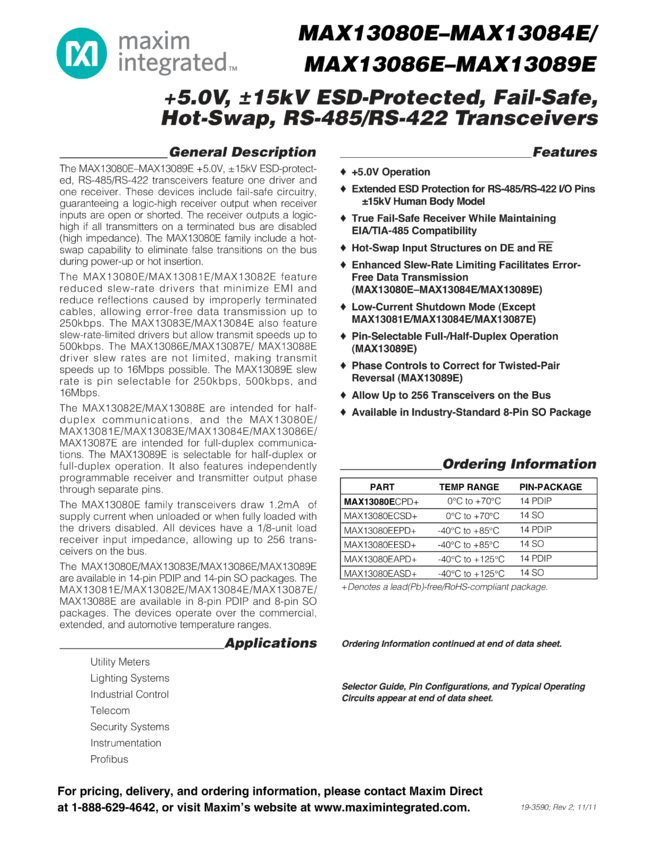 MAX13080E, MAX13081E, MAX13082E, MAX13083E, MAX13084E, MAX13086E, MAX13087E, MAX13088E, MAX13089E +5.0V, ±15kV ESD-Protected, Fail-Safe, Hot-Swap, RS-485/RS-422 Transceivers