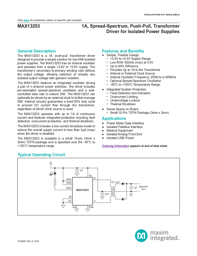 MAX13253 1A Spread-Spectrum Push-Pull Transformer Driver for Isolated Power Supplies