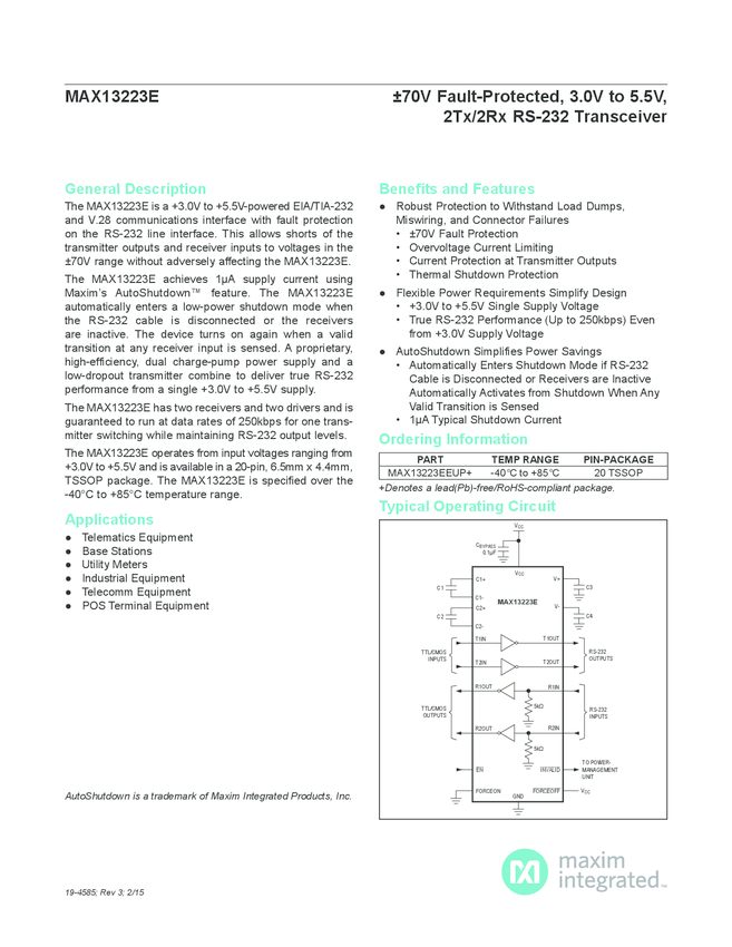 MAX13223E &#17770V Fault - Protected, 3.0 to 5.5V, 2TX/2RX RS-232 Transceiver