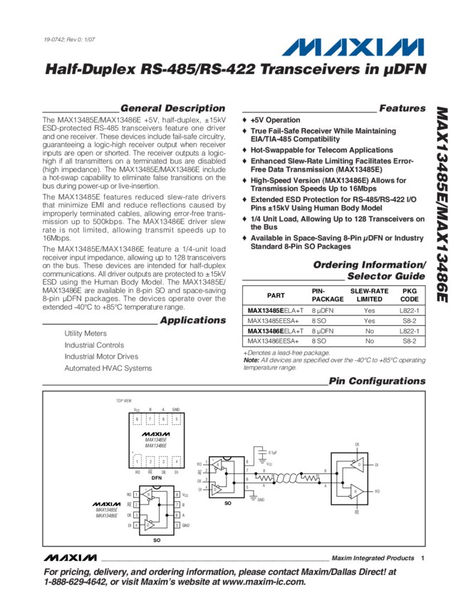 MAX13486E Half-Duplex, High-Speed RS-485/RS-422 Transceivers in &microDFN