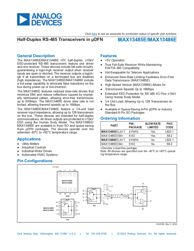 MAX13487E, MAX13488E Half-Duplex RS-485/RS-422-Compatible Transceiver with AutoDirection Control