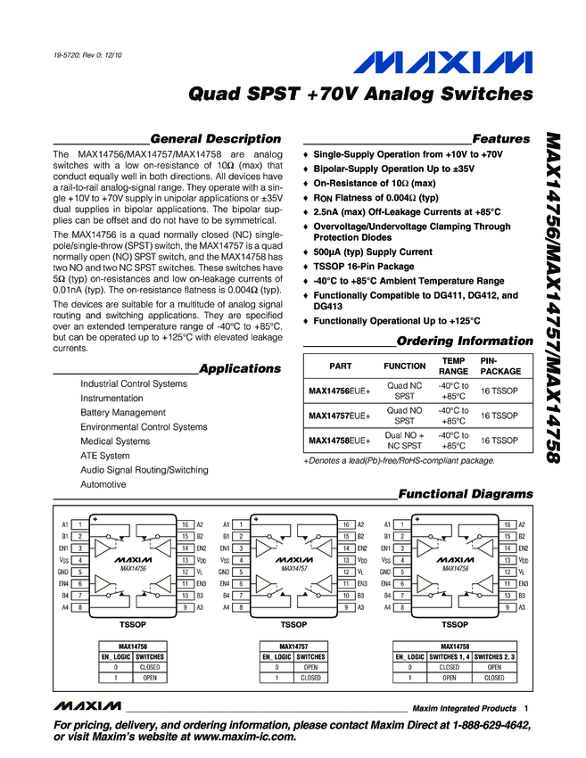MAX14756, MAX14757, MAX14758 Quad SPST +70V Analog Switches