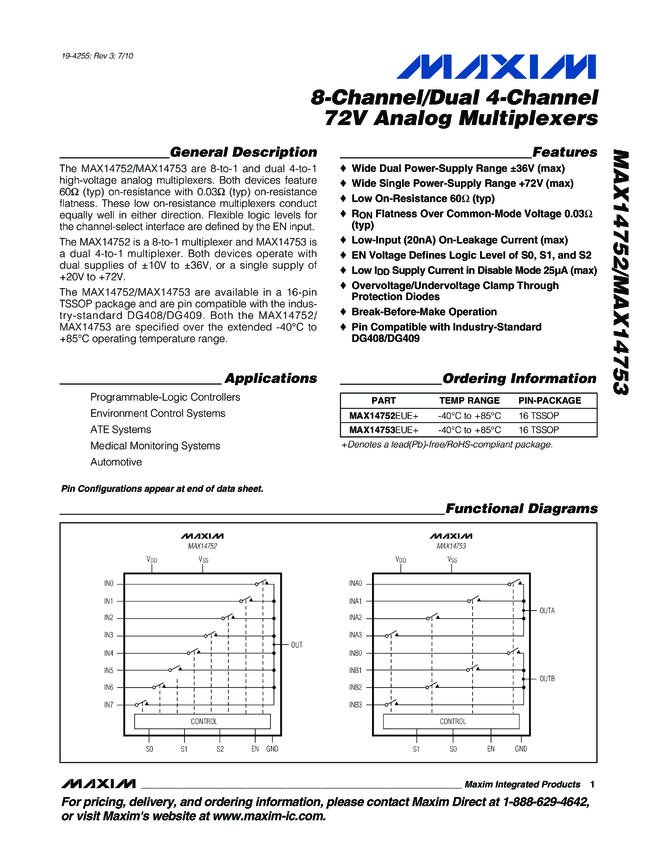 MAX14752, MAX14753 8-Channel/Dual 4-Channel 72V Analog Mux