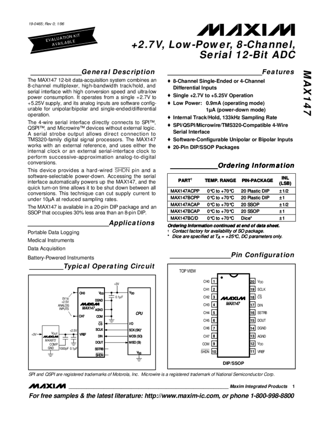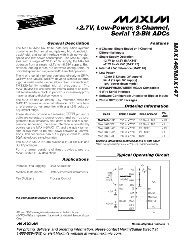MAX146, MAX147 +2.7V, Low-Power, 8-Channel, Serial 12-Bit ADCs