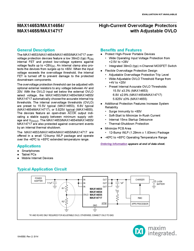 MAX14653, MAX14654, MAX14655 High-Current Overvoltage Protector with Integrated Surge Protection