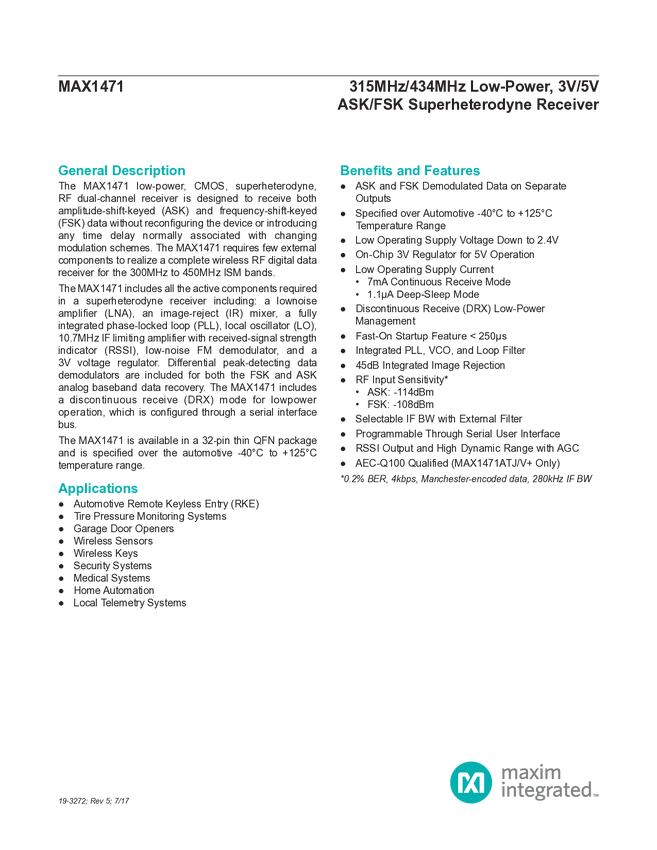315MHz/434MHz Low-Power, 3V/5V ASK/FSK Superheterodyne Receiver