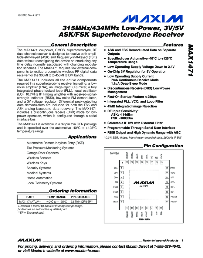 RF Receiver ASK/FSK 2.5V/3.3V/5V 32-Pin TQFN EP