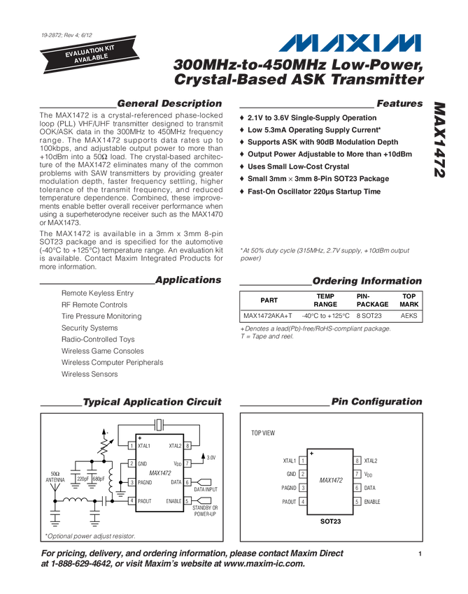 300MHz-to-450MHz Low-Power, Crystal-Based ASK Transmitter
