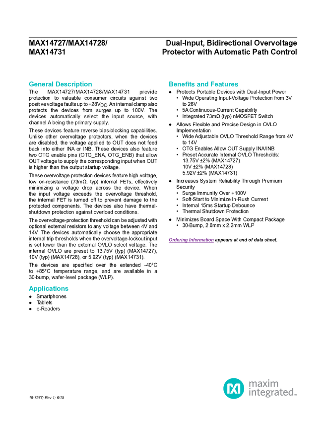 Dual-Input, Bidirectional Overvoltage Protector with Automatic Path Control