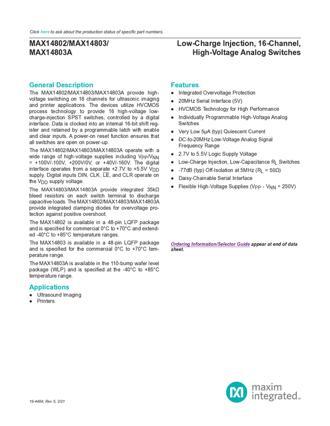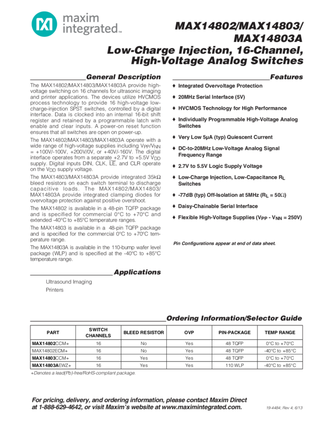 MAX14802, MAX14803, MAX14803A Low-Charge-Injection, 16-Channel, High-Voltage Analog Switches