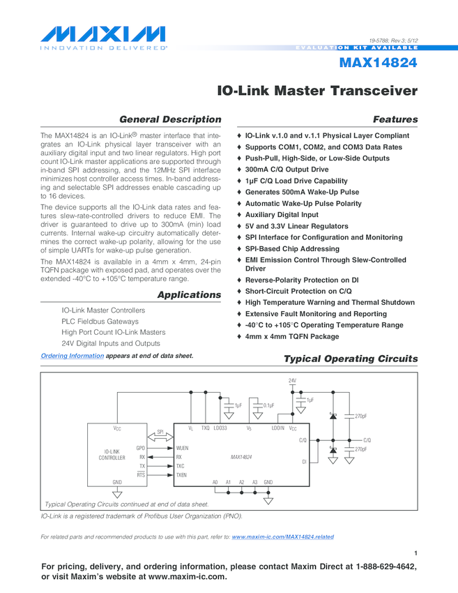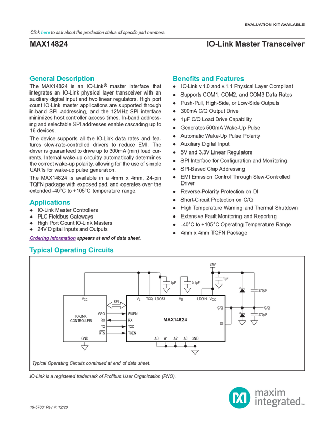 MAX14824 IO-Link Master Transceiver