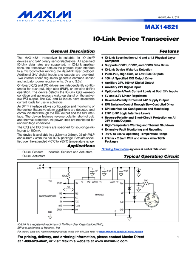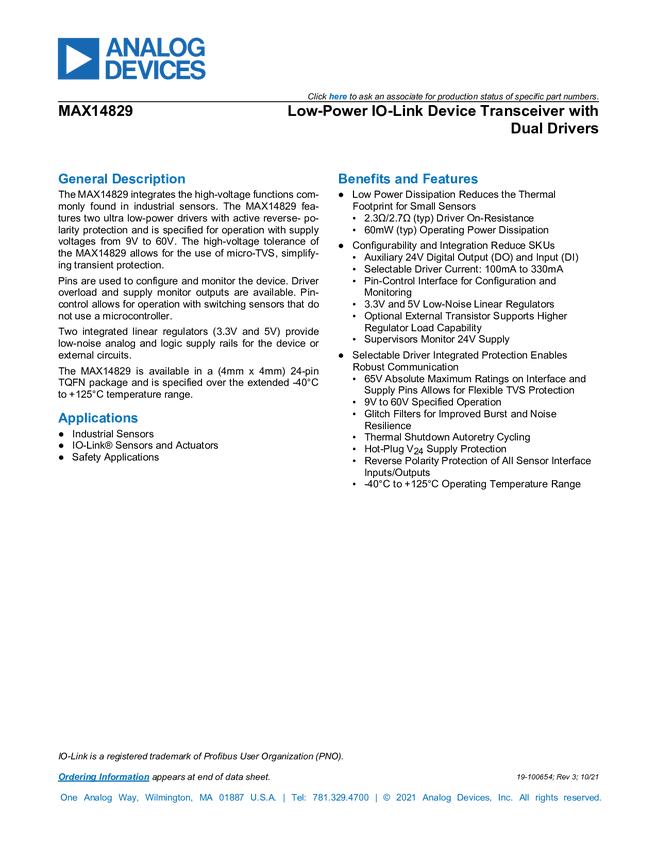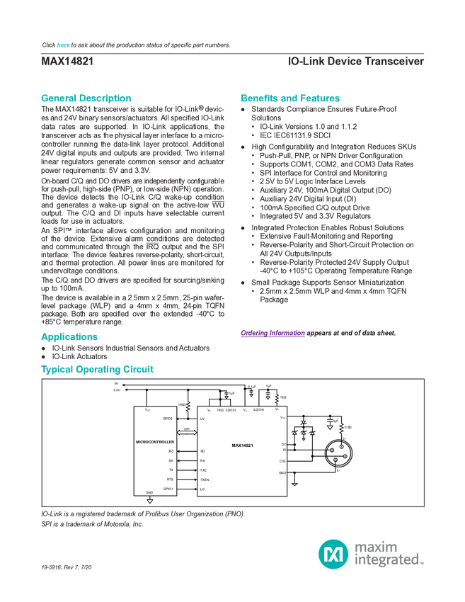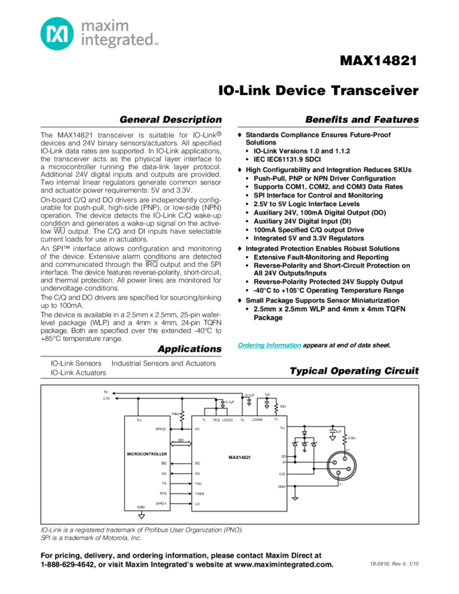 MAX14821 IO-Link Device Transceiver