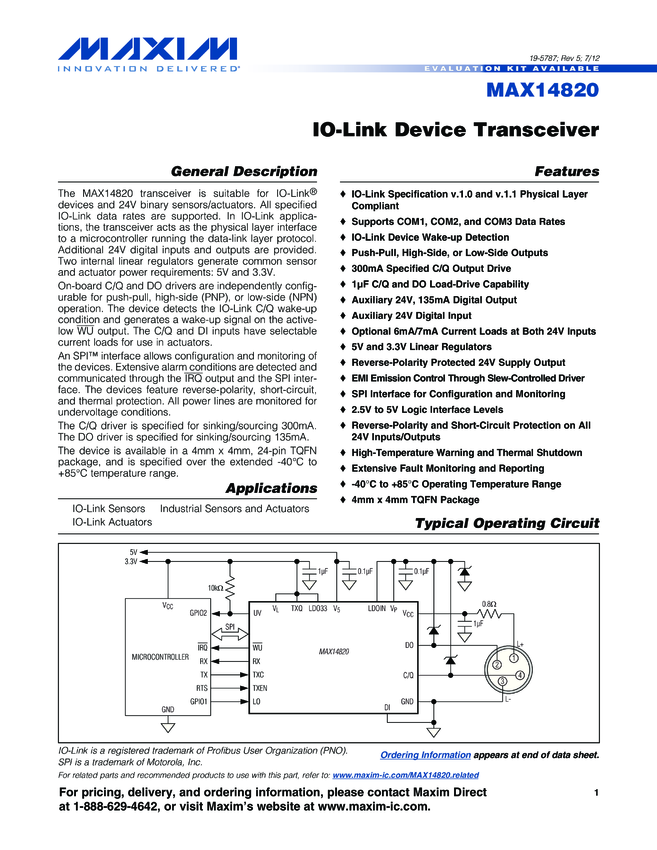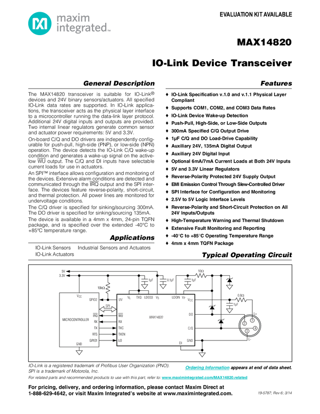 MAX14820 IO-Link Device Transceiver