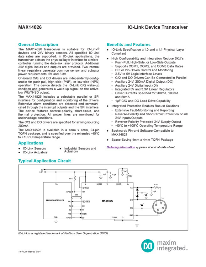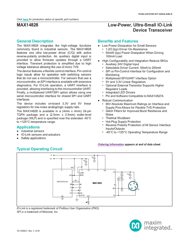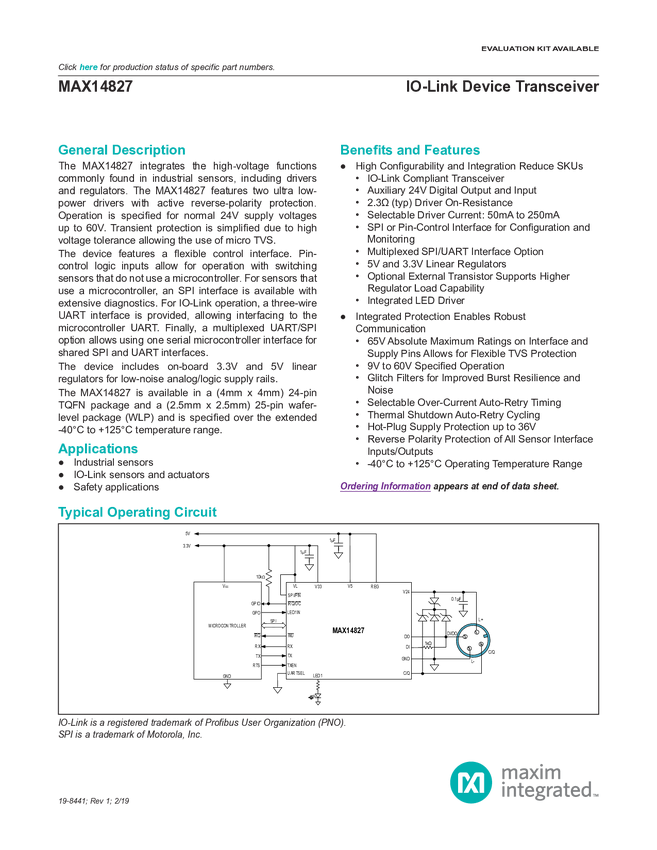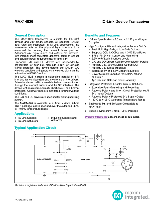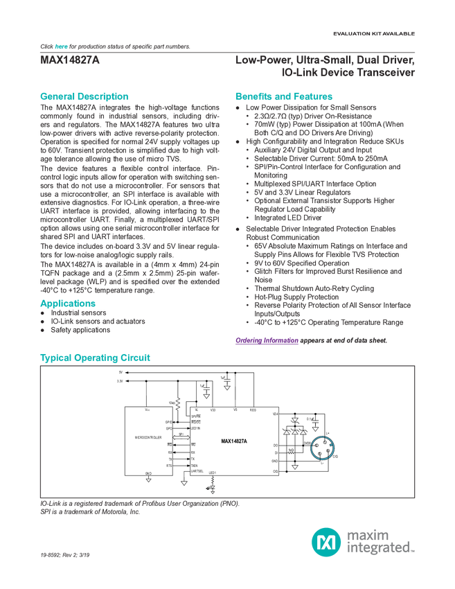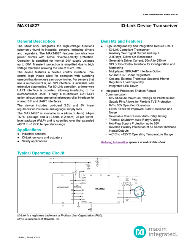 MAX14827 IO-Link Device Trasnceiver