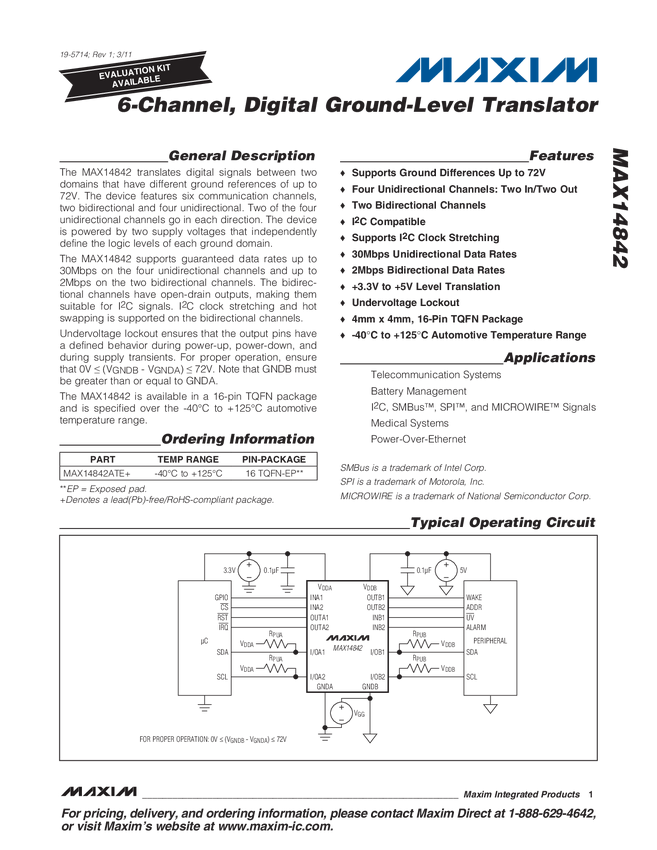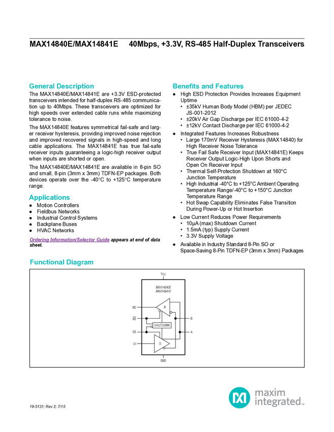 MAX14840E, MAX14841E 40Mbps, +3.3V, RS-485 Half-Duplex Transceivers