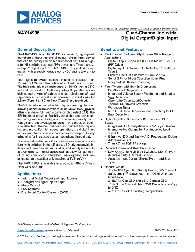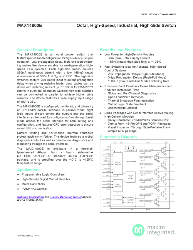 MAX14900E Octal, High-Speed, Industrial, High-Side Switch