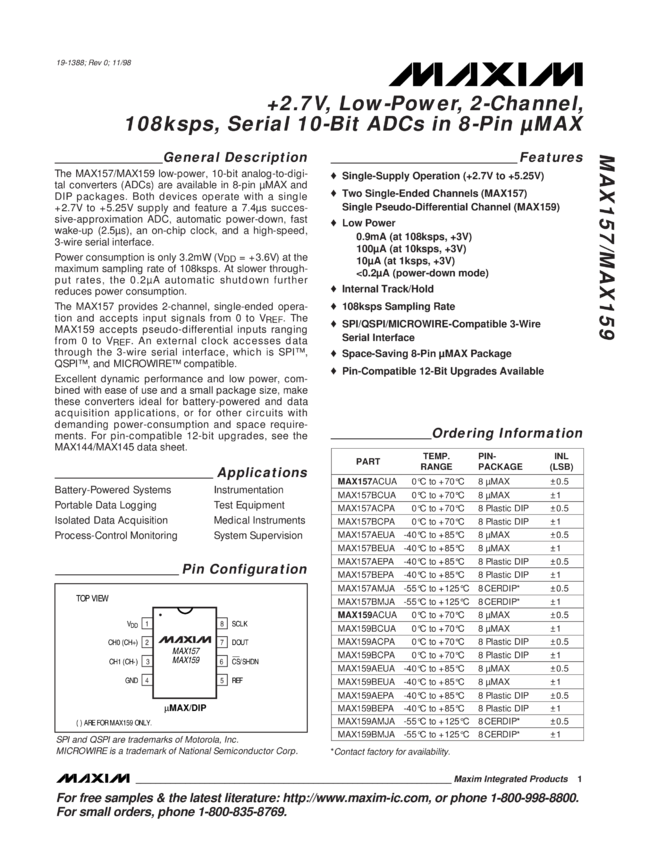 MAX157, MAX159 +2.7V, Low-Power, 2-Channel, 108ksps, Serial 10-Bit ADCs in 8-Pin µMAX