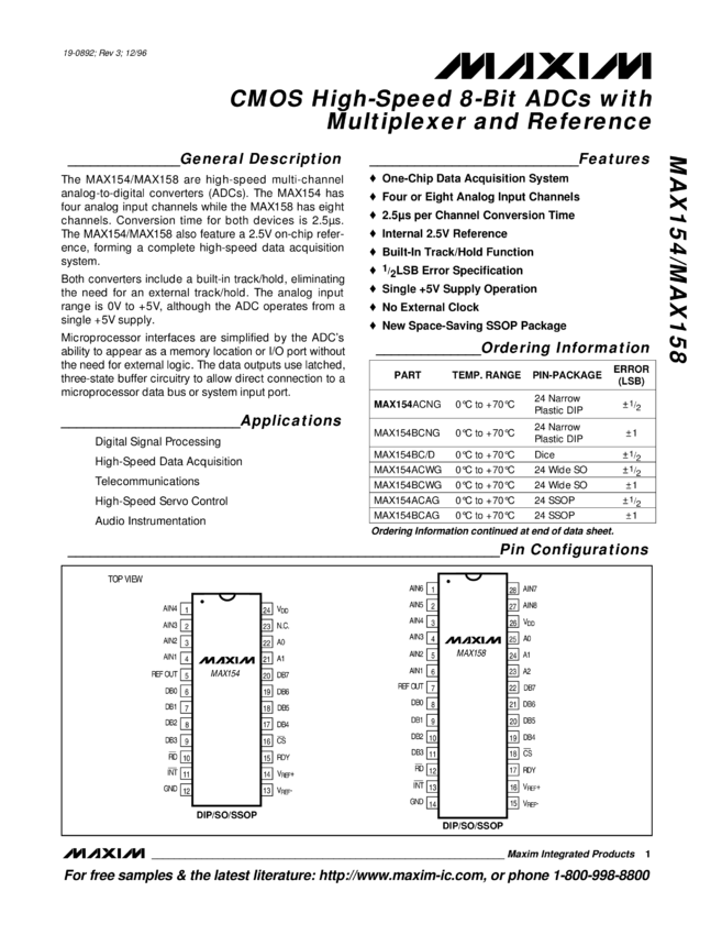 MAX154, MAX158 CMOS High-Speed, 8-Bit ADCs with Multiplexer and Reference