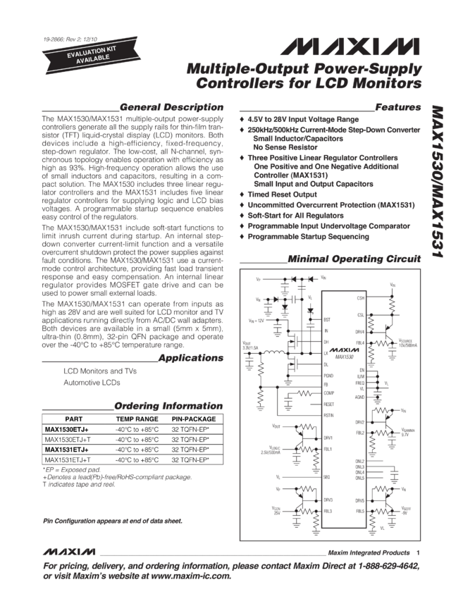MAX1530, MAX1531 Multiple-Output Power-Supply Controllers for LCD Monitors