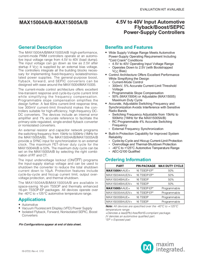MAX15004, MAX15005 4.5V to 40V Input Automotive Flyback/Boost/SEPIC Power-Supply Controllers