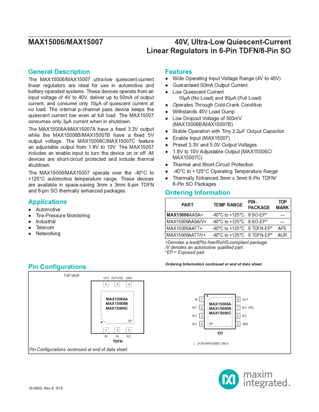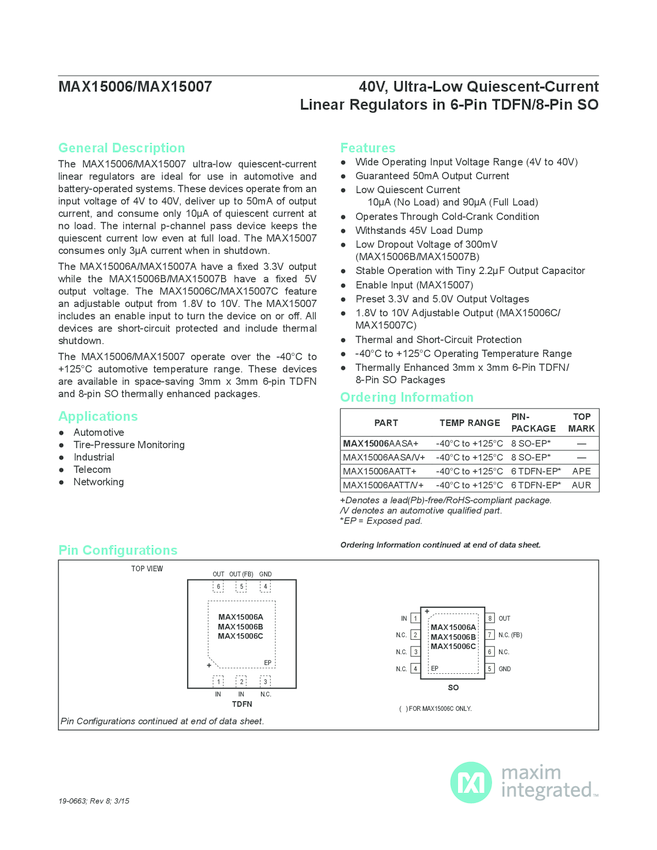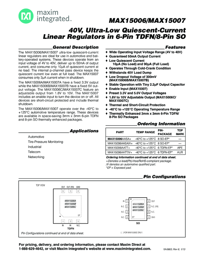 MAX15006, MAX15007 40V, Ultra-Low Quiescent-Current Linear Regulators in 6-Pin TDFN/8-Pin SO