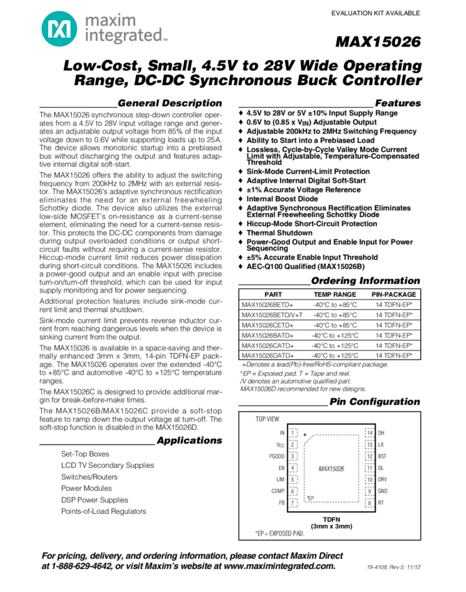 MAX15026 Low-Cost, Small, 4.5V to 28V Wide Operating Range, DC-DC Synchronous Buck Controller