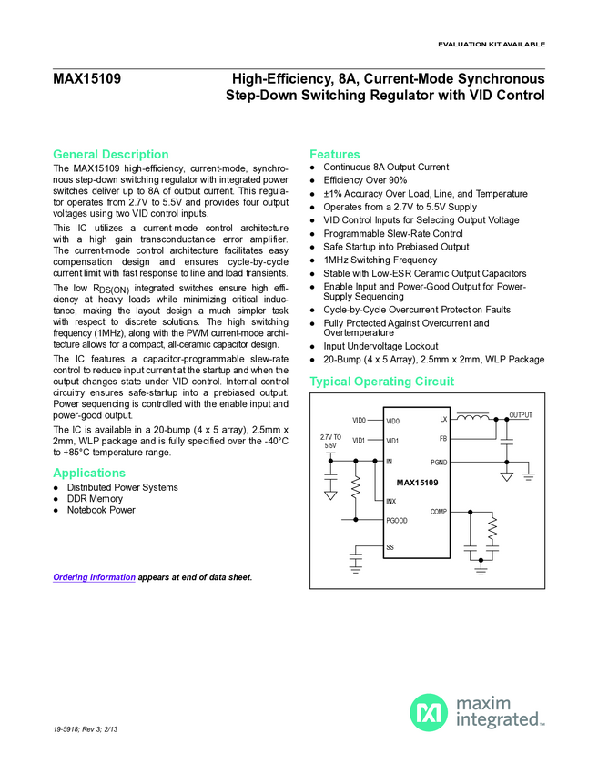 MAX15109 High-Efficiency, 8A, Current-Mode Synchronous Step-Down Switching Regulator with VID Control