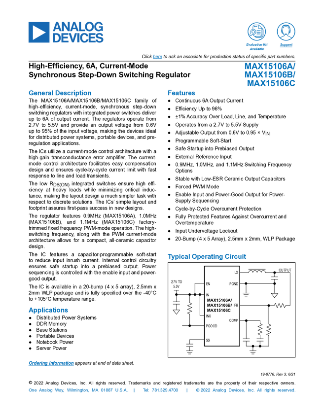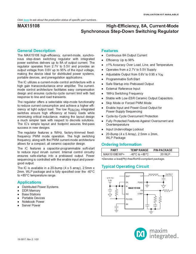 MAX15108 High-Efficiency, 8A, Current-Mode Synchronous Step-Down Switching Regulator