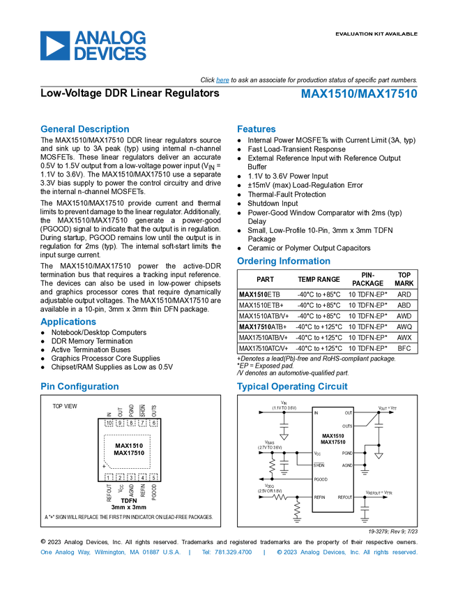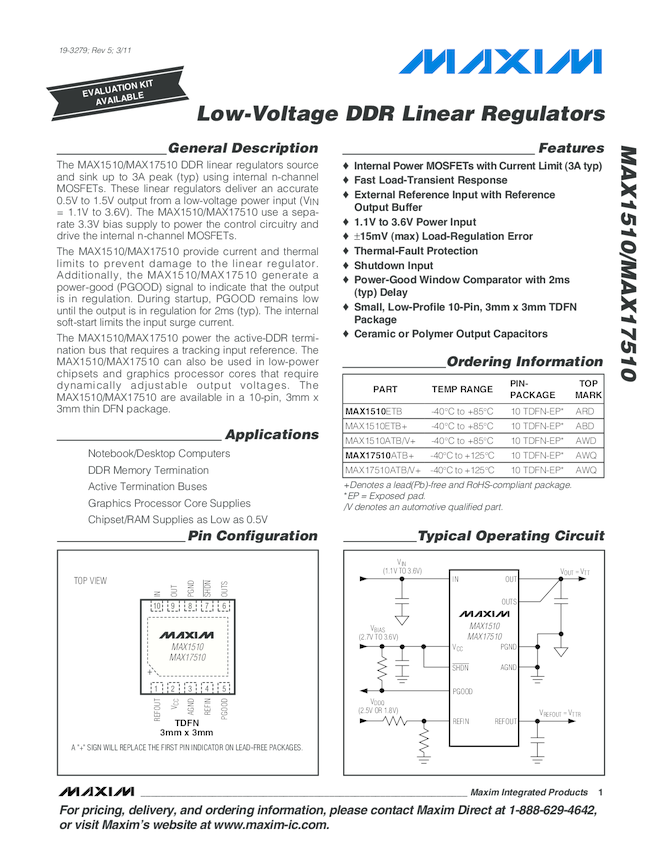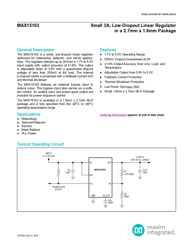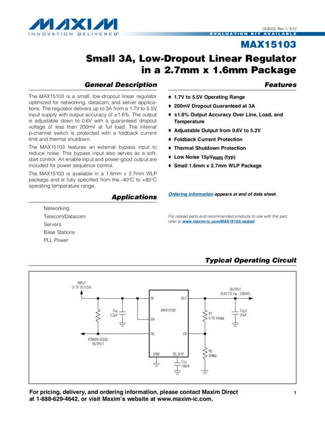 MAX15103 Small 3A, Low-Dropout Linear Regulator in a 2.7mm x 1.6mm Package