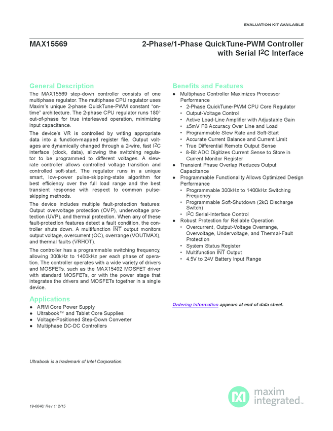 MAX15569 2-Phase/1-Phase, QuickTune-PWM Controller with Serial I²C Interface