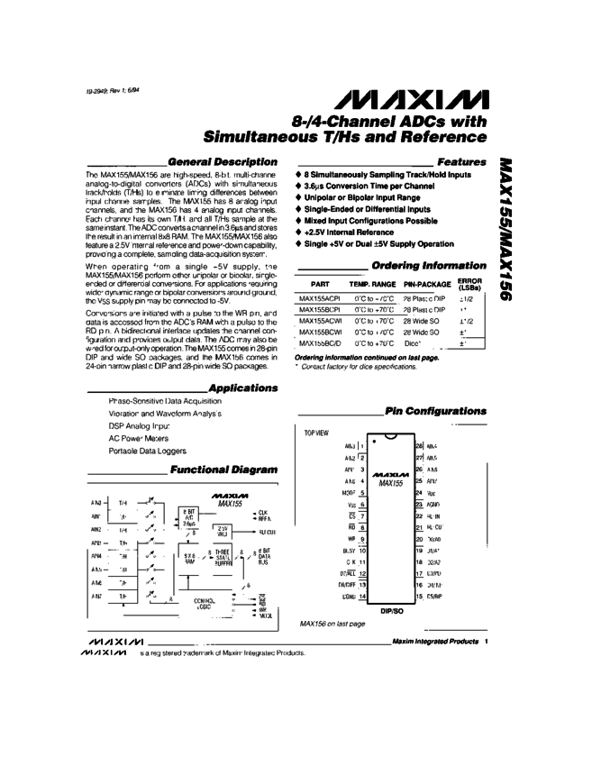 MAX155, MAX156 High-Speed, 8-Channel, 8-Bit ADC with Simultaneous Track/Holds and Reference