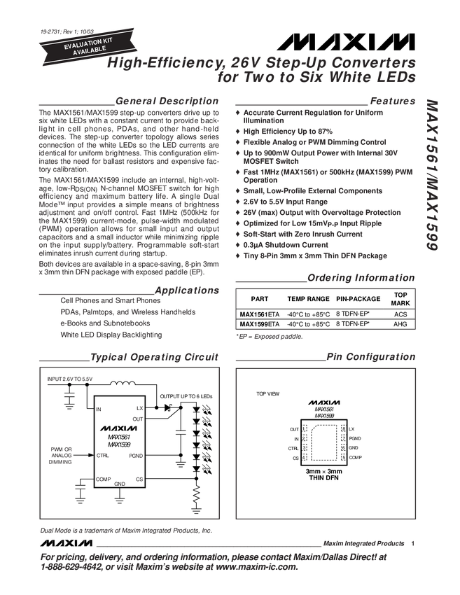 High-Efficiency, 26V Step-Up Converters for Two to Six White LEDs