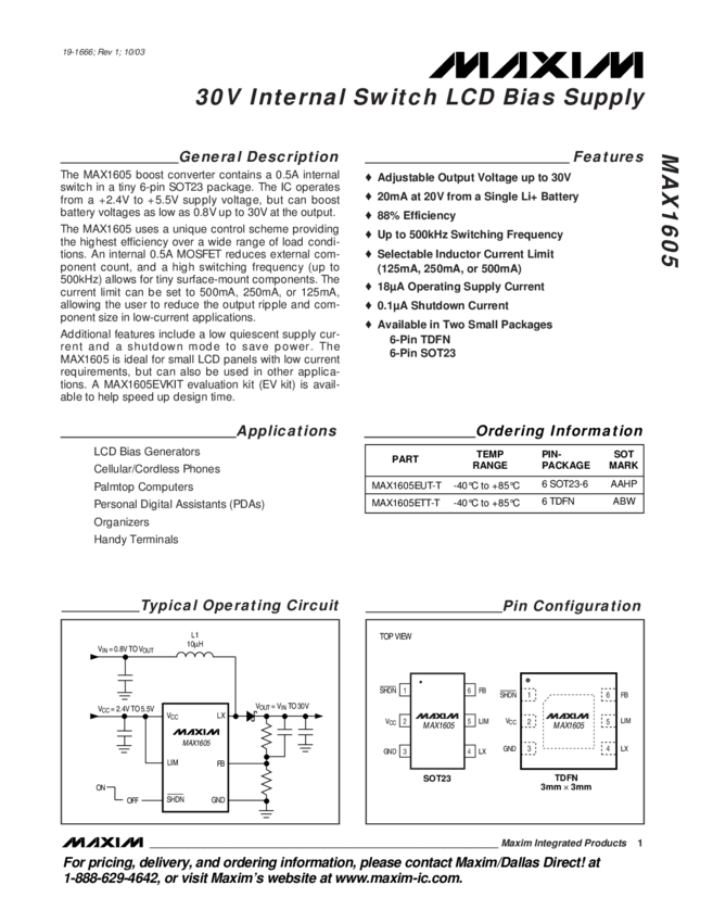 MAX1606 28V Internal Switch LCD Bias Supply with True Shutdown™