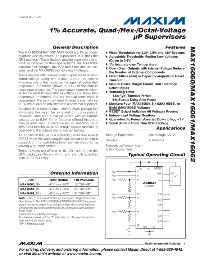 MAX16060, MAX16061, MAX16062 1% Accurate, Quad-/Hex-/Octal-Voltage µP Supervisors