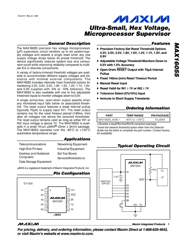 MAX16055 Ultra-Small, Hex Voltage, Microprocessor Supervisor