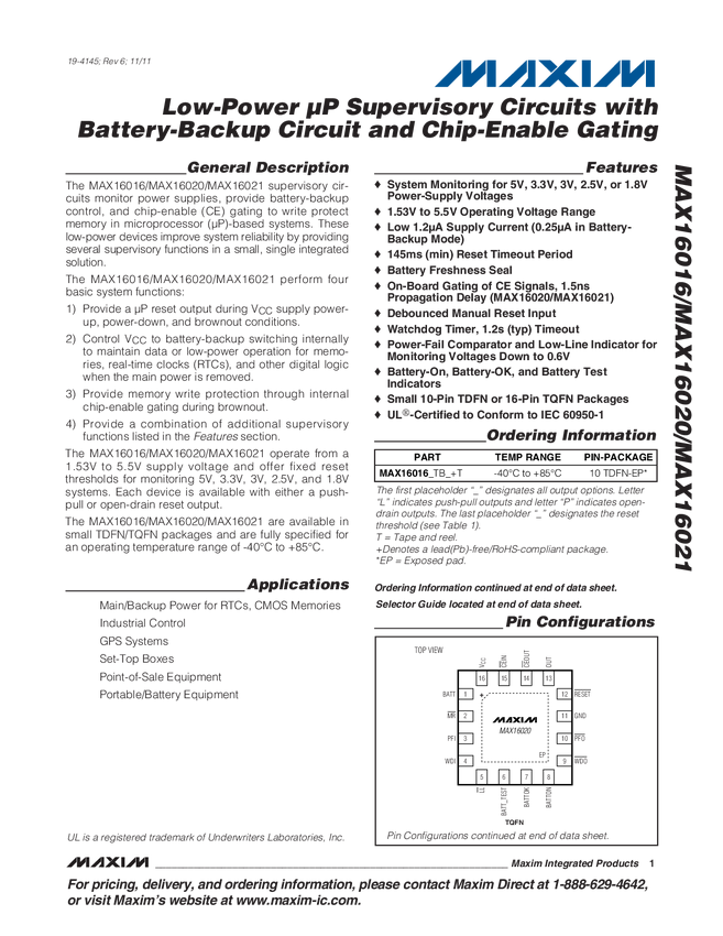 Low-Power μP Supervisory Circuits with Battery-Backup Circuit and Chip-Enable Gating