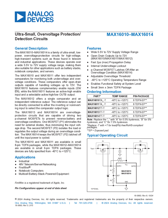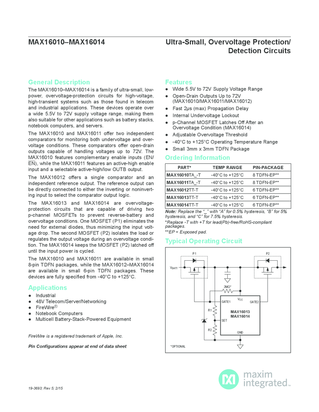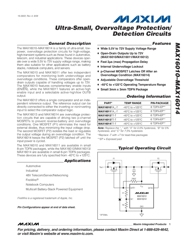 MAX16010, MAX16011, MAX16012, MAX16013, MAX16014 Ultra-Small, Overvoltage Protection/Detection Circuits