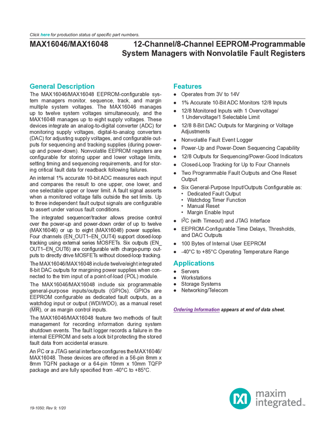 MAX16046, MAX16048 12-/8-Channel EEPROM-Programmable System Managers with Nonvolatile Fault Registers