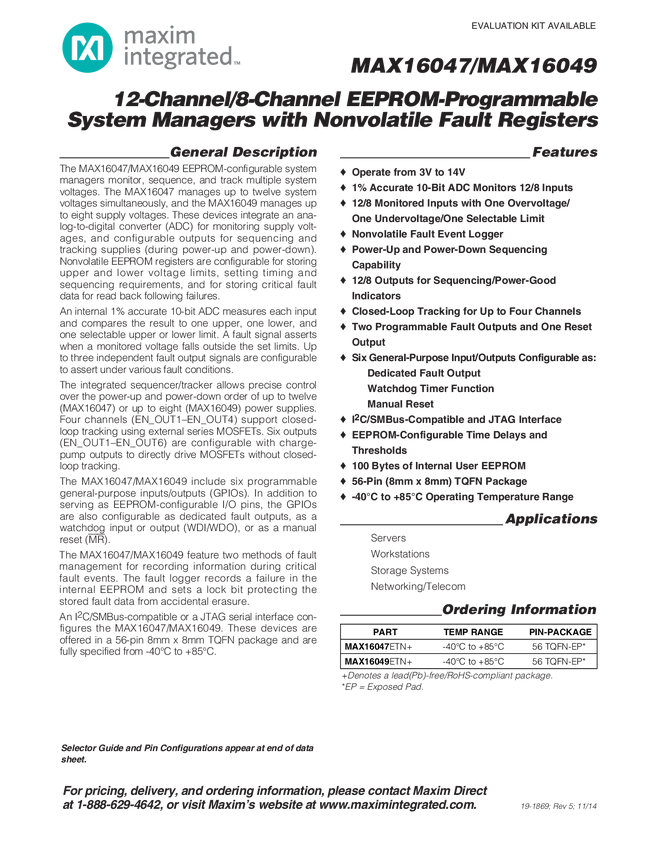 MAX16047, MAX16049 12-/8-Channel EEPROM-Programmable System Managers with Nonvolatile Fault Registers