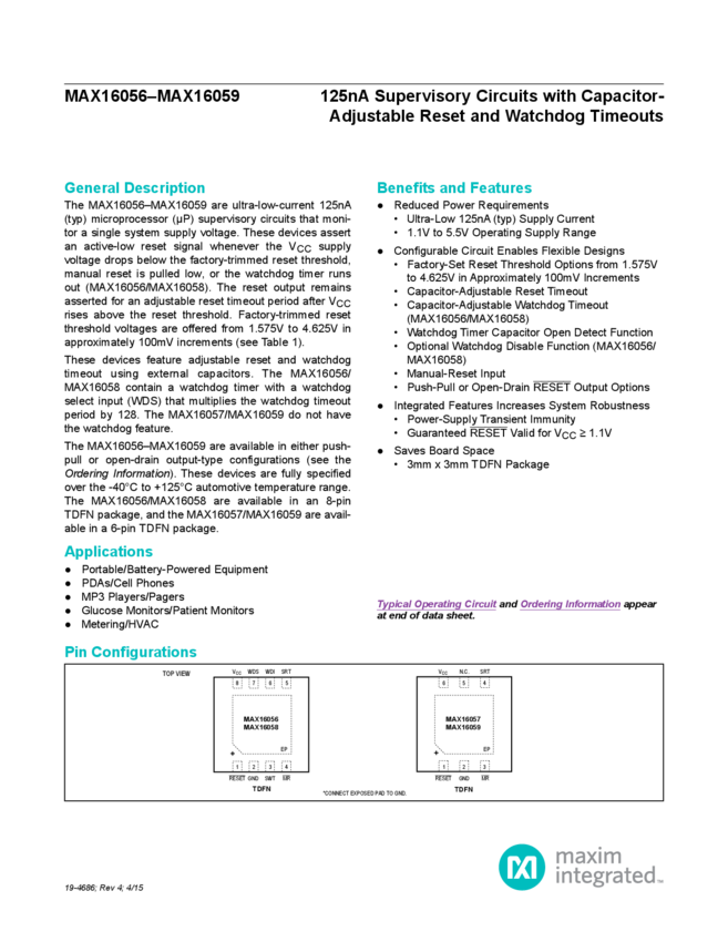 MAX16056, MAX16057, MAX16058, MAX16059 125nA Supervisory Circuits with Capacitor-Adjustable Reset and Watchdog Timeouts