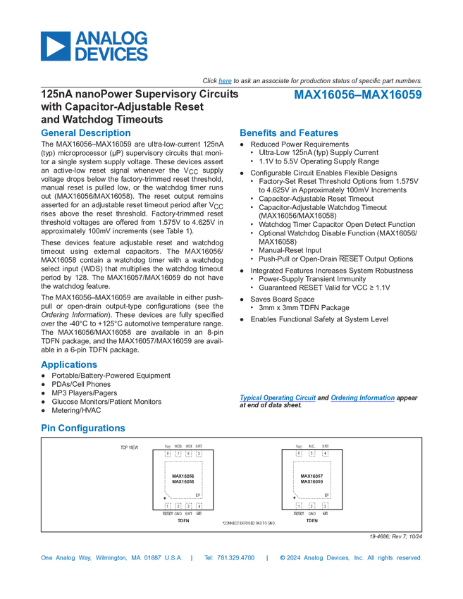 MAX16056, MAX16057, MAX16058, MAX16059 125nA Supervisory Circuits with Capacitor-Adjustable Reset and Watchdog Timeouts